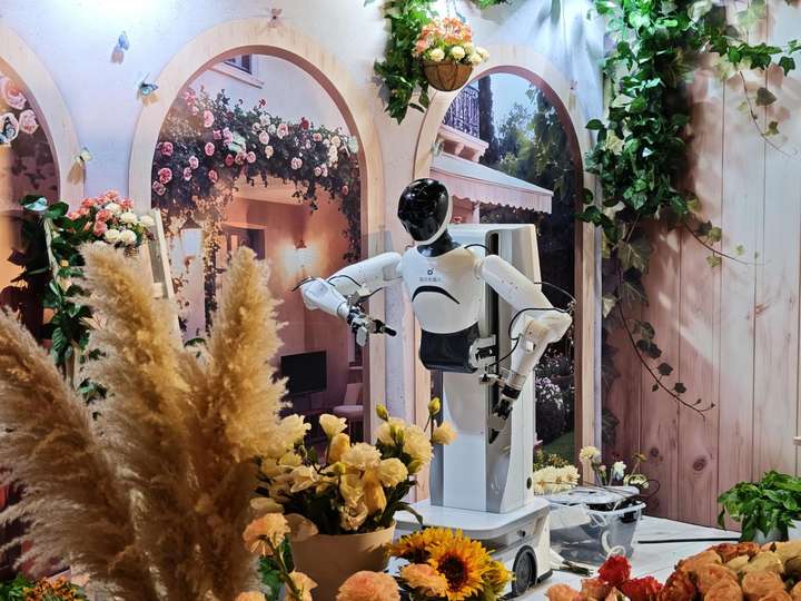 随后,远征A2作为机器人“运动员”领队参与集体宣誓环节。开幕式结束后的赛事期间,智元机器人具身业务部产品系统负责人严亦行在机器人插花比赛场景中,为到场的上海市副市长陈杰等领导与嘉宾介绍了赛道设置及相关机器人产品情况。