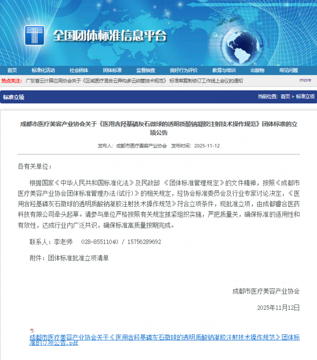产品已获中国NMPA最高级别械三认证,生产与临床应用均严格遵循医疗器械监管要求。此外,行业规范也持续完善——成都市医疗美容产业协会已正式发布《医用含羟基磷灰石微球的透明质酸钠凝胶注射技术操作规范》团体标准立项公告,由成都睿合医药科技有限公司牵头起草。该标准将进一步规范含CaHA产品的临床使用,保障操作安全与疗效统一,推动行业向更专业、更安全的方向发展。