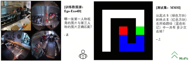 只在Ego-Exo4D上训练第一/第三人称视角匹配的模型可以大幅提升(+90.4%)在MMSI的2D迷宫导航问题上的表现